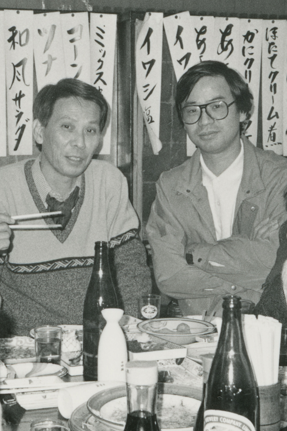 野外研では会員の持つ里山でタケノコ狩りをし皆で食べたり、夜は名古屋の飲み屋で語りあったりした。かって野外研ではトランプゲームの大貧民が流行ったらしいが、私は一度だけ参加した記憶がある。その頃の写真で信也さんと私が写っているものを2枚載せておく。