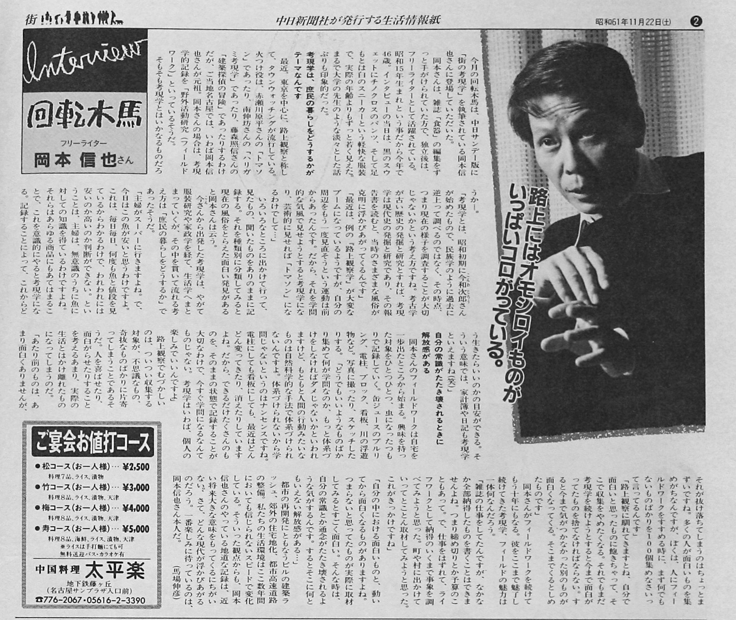 開業当時は収入が不安定でやっていけるのか不安だったが、フリーになり活動していた信也さんが中日新聞の人を紹介してくれた。そのお陰で中日新聞が発行する生活情報誌「街」の撮影を、開業間もない頃から依頼されるようになった。下の写真は1986年11月22日発行の「街」で岡本信也さんを取り上げたページだが、写真撮影は私が担当した。